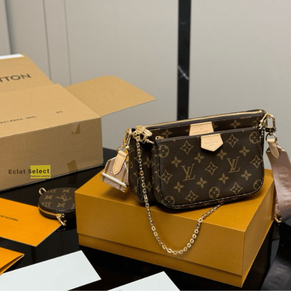 The Multi Pochette Accessoires is a combination of a Pochette Accessoires clutch, a Mini Pochette Accessoires clutch and a round coin purse, all in Monogram canvas with multiple pockets and compartments, and embellished with a mini Monogram pattern. sides. A detachable chain and adjustable Louis Vuitton Jacquard shoulder strap allow for a variety of carrying options.