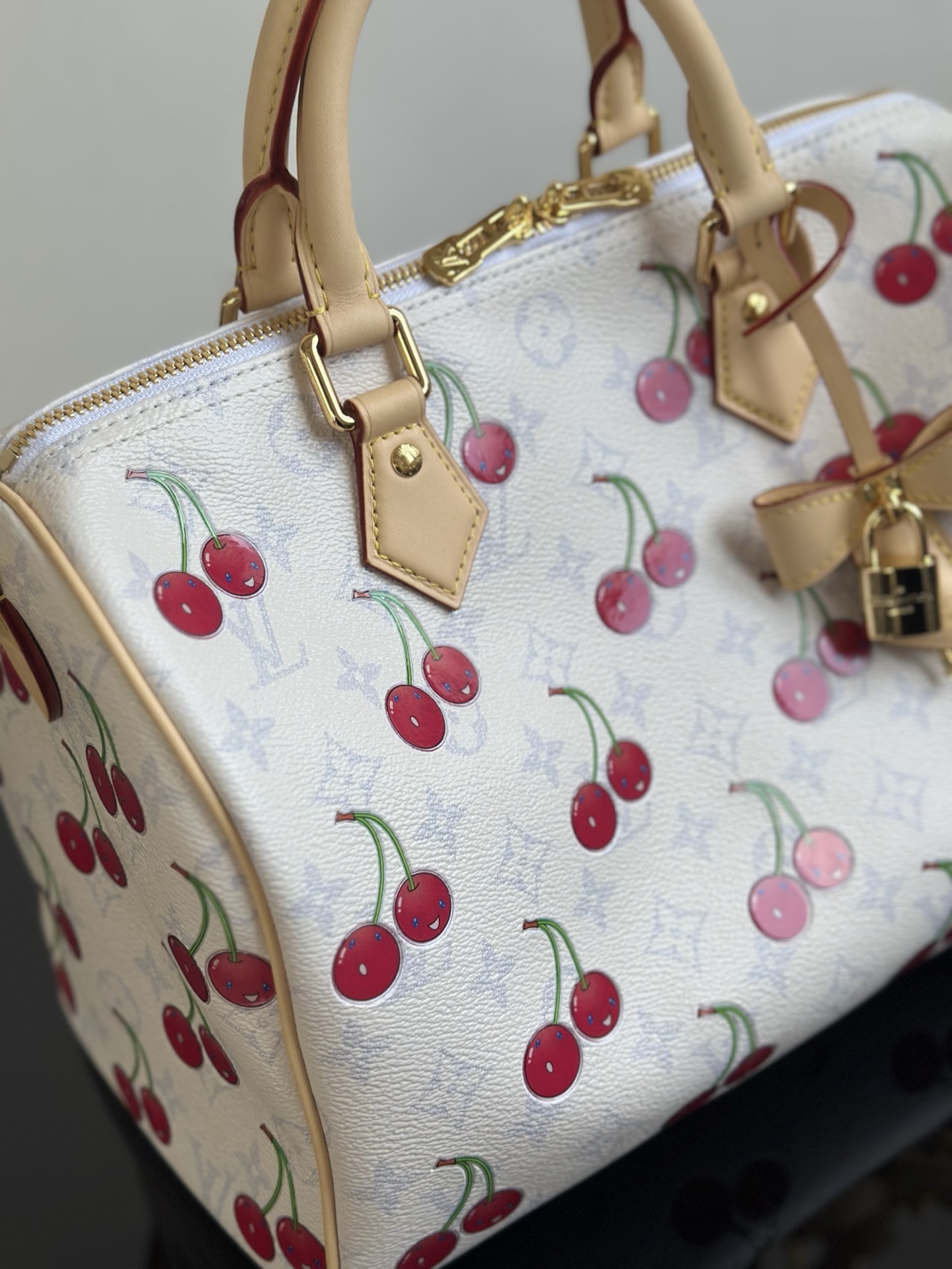 The Speedy Soft 30 exudes elegance as part of the spirited second edition of the Louis Vuitton x Murakami collection. Crafted from Monogram coated canvas in an understated shade, the Japanese artist’s exuberant cherry motifs introduce a bold burst of color. The Toron top handles and removable Toron shoulder strap strike a contrast in natural leather, while the inside is lined with denim. A bow-shaped keybell completes the look with a final flourish.