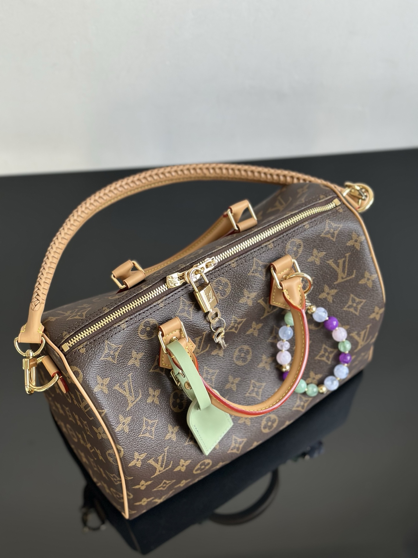 The iconic Speedy Soft 30 Lucky is reinvented with jewel-like embellishments and a contrasting pastel lining to enhance its attention to detail. It is crafted from signature Monogram canvas trimmed with VVN leather and is adorned with gold-toned hardware and a unique talisman charm that can be removed if desired. Capaciously sized, the versatile design is roomy enough to store a tablet as well as other daily essentials.